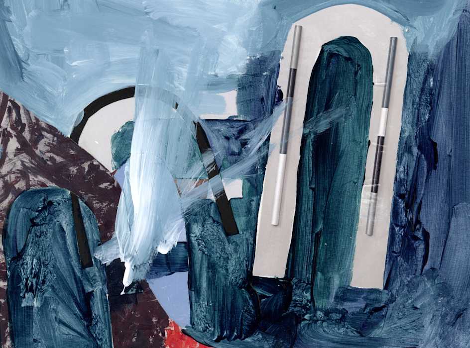 “Ambulant” is a word that Arango Palacios likes to use to describe their work (alluding to their history of migrating— from Colombia to various southern states in the US). The way that they use pieces of their experiences contributes to this sensation: angels, jungles, nightclubs, cowboys, football— these disparate images meld together in a fantastical fugue. “Oftentimes, as an immigrant, once you leave your homeland, your homeland changes forever; it never becomes the same. And you’re stuck in this loop of memory; memory is all you can carry with you.” Arango Palacios hesitates to call their paintings 2-dimensional because their process of painting is a “sculptural” one: thick layers of paint, gluing items to the canvas, scraping paint away. According to Arango Palacios, there is a stark difference between an “applied” image and a “constructed” one (their recent fibers artwork heads even more into a constructive process of image making). Something similar is happening when Arango Palacios imagines safe spaces in their work: scouring memories for pockets of intimacy, scraping symbols of certain meanings and then repurposing them, and attaching these disparate things in piecemeal— all this in service to create “this fantastical zone of safety for queer folk.”
